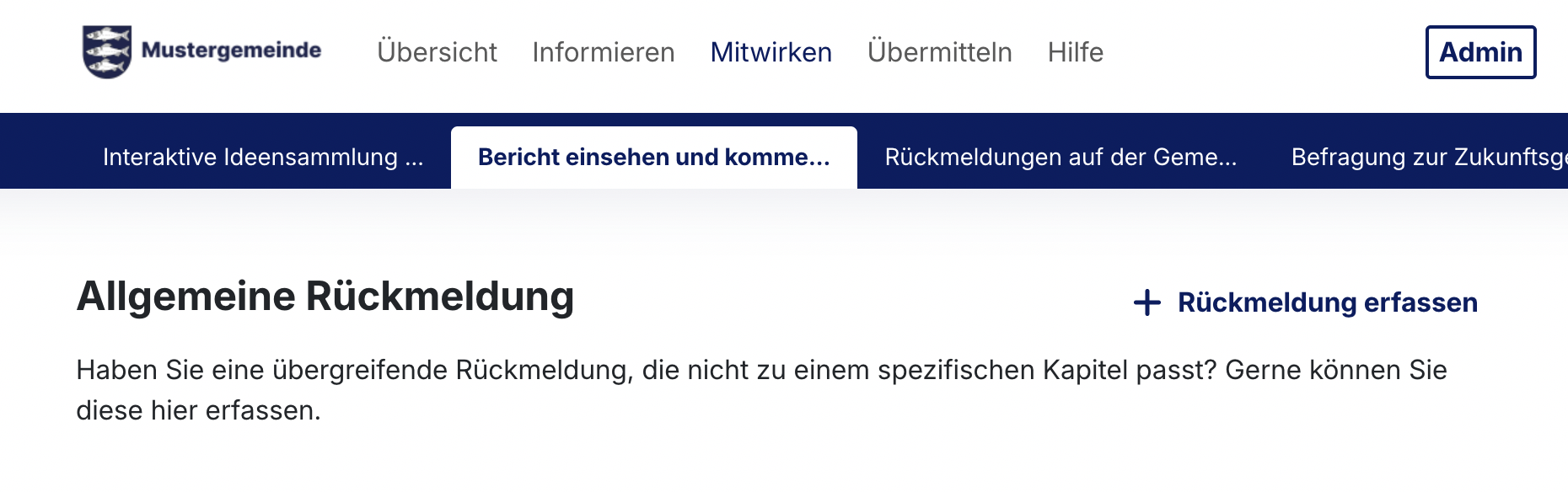 In einigen Fällen möchten Teilnehmende auch zusätzliche Unterlagen im Rahmen ihrer Stellungnahme übermitteln – beispielsweise ein Schreiben mit einer zusammenfassenden Beurteilung oder ein formeller Beschluss (z. B. eines Gemeinderats). Auch hierfür eignet sich ein Bereich für allgemeine Rückmeldungen, da dort zusätzlich Dateien hochgeladen werden können.