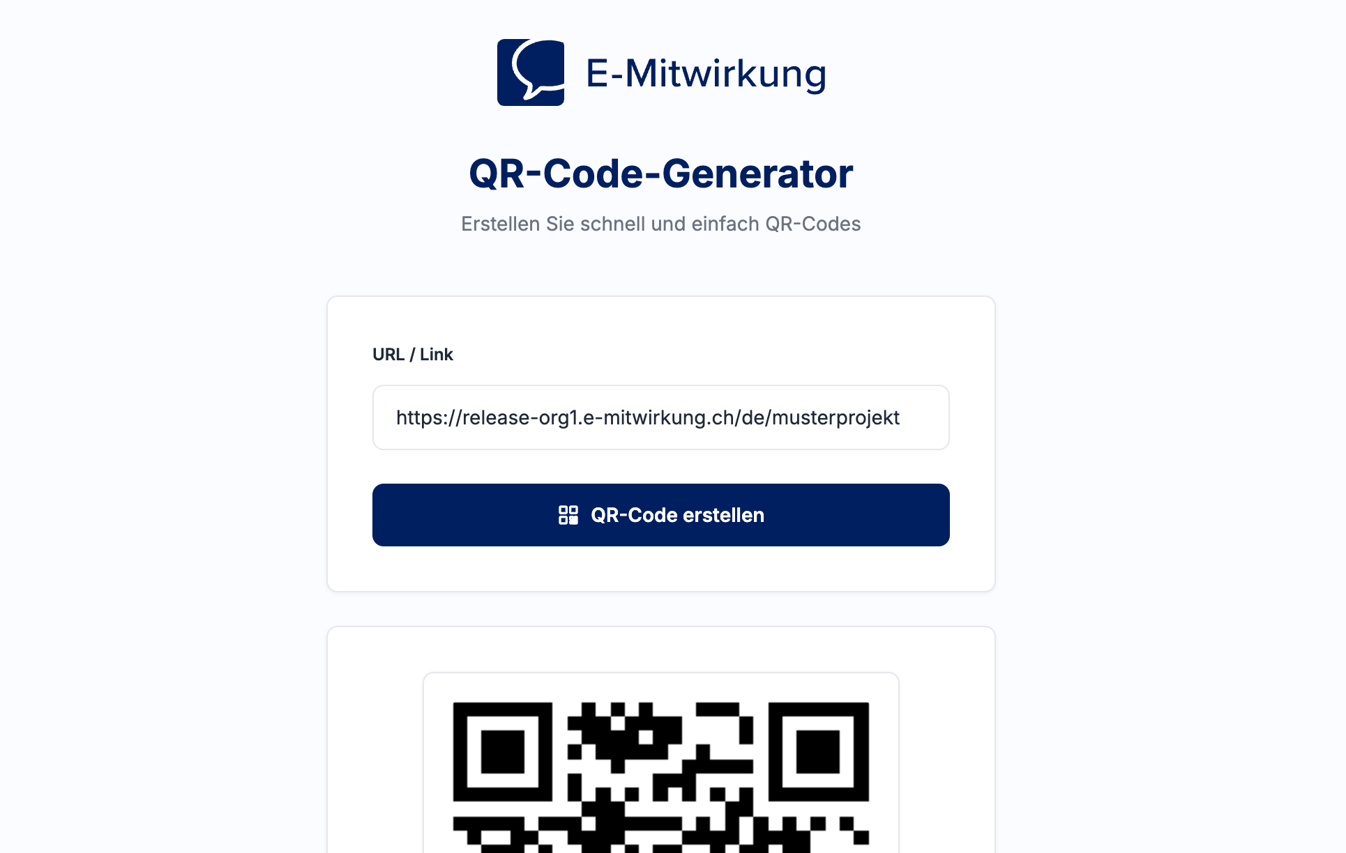 https://tools.e-mitwirkung.ch/qr-code/ öffnen können. Nach der Eingabe des Links (aus Schritt 4) erhalten Sie direkt einen QR-Code.