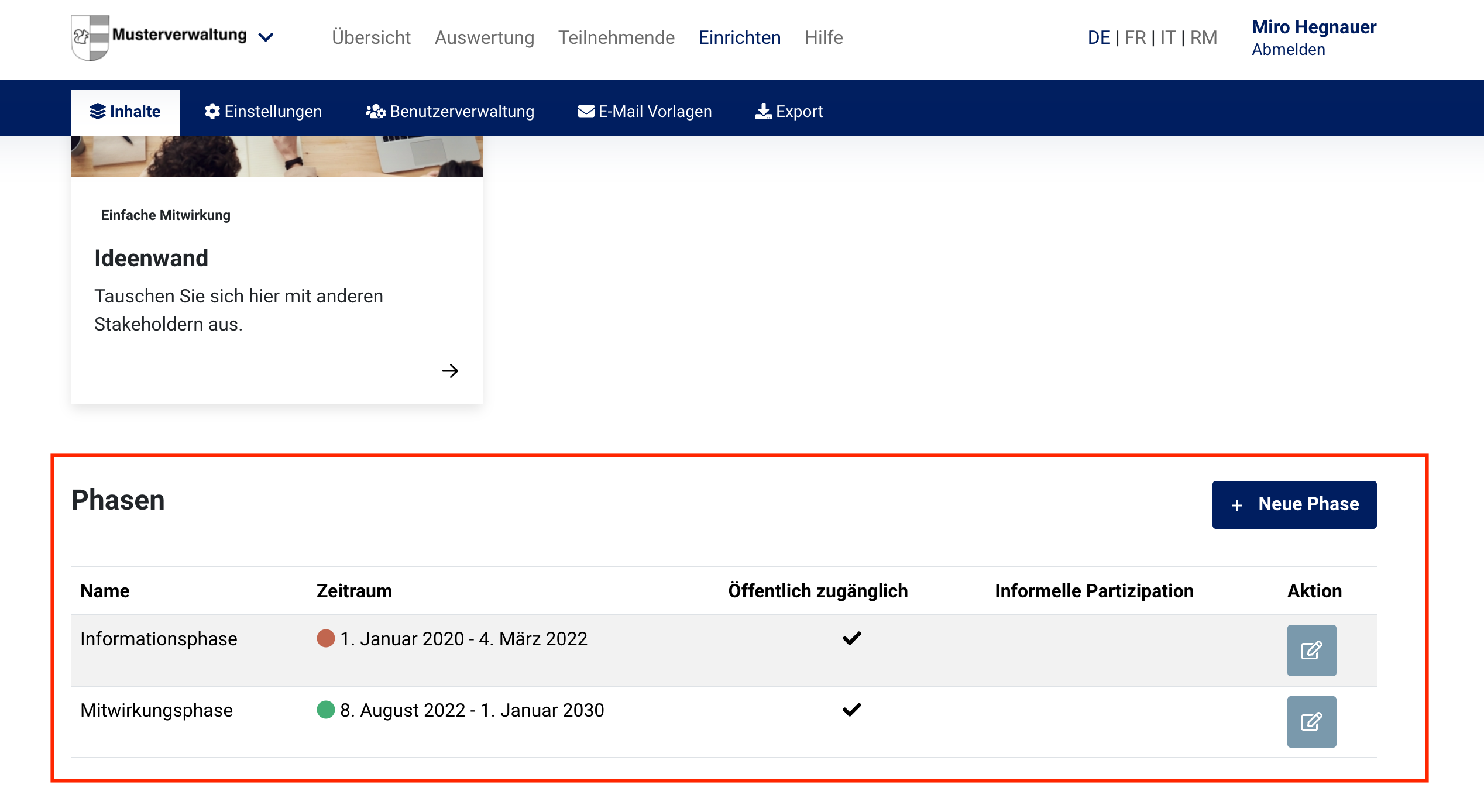 Jedes Projekt besteht aus einer oder mehreren Phasen. Die Phase legt fest, wer das Projekt einsehen kann und wie lange. Die Phasen verwalten Sie im Admin-Bereich unter «Einrichten > Inhalte» am Seitenende.