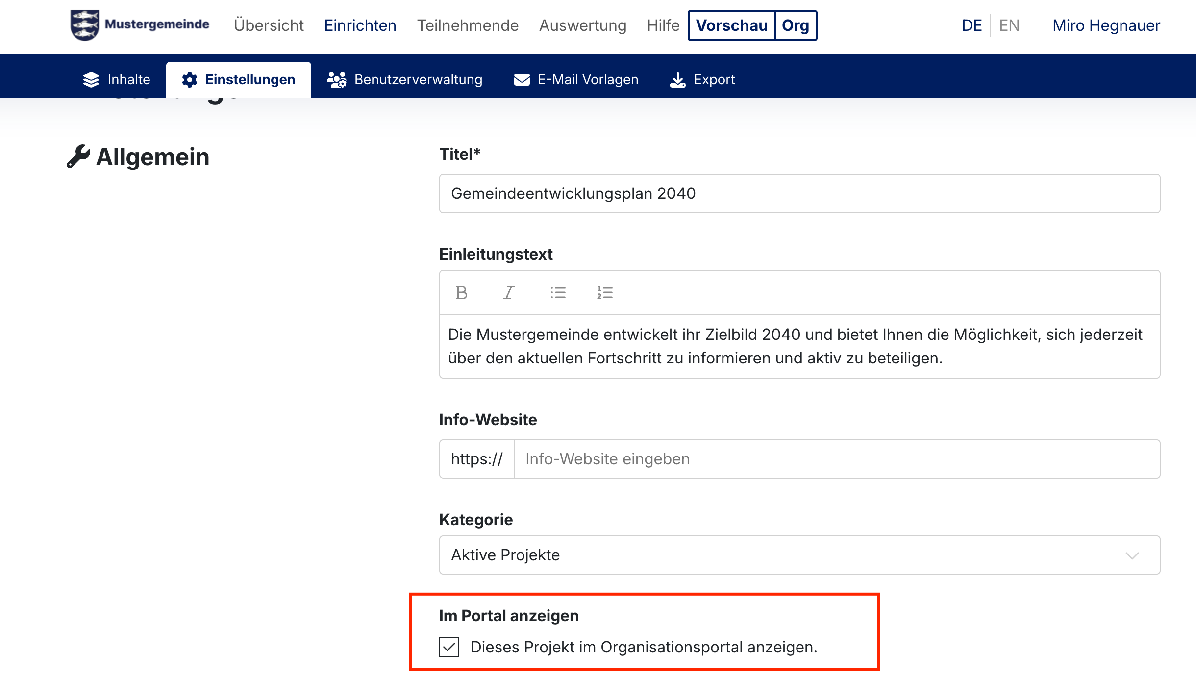 Damit das Projekt im öffentlichen Portal als Kachel angezeigt wird, aktivieren Sie in den Projekteinstellungen unter «Einrichten > Einstellungen» die Option «Dieses Projekt im Organisationsportal anzeigen» und klicken Sie auf «Speichern».