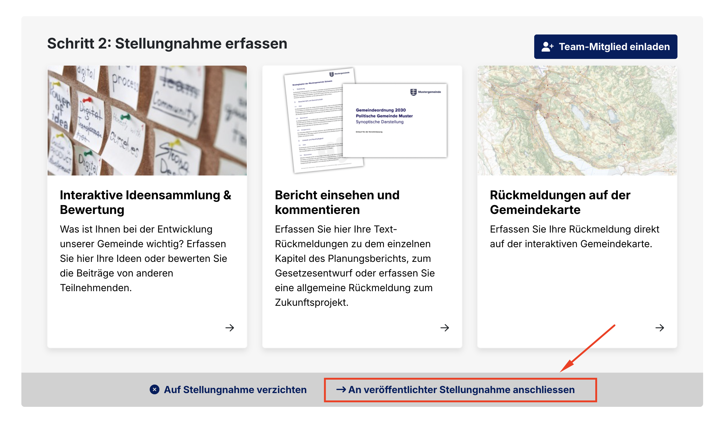 Als Teilnehmenden können Sie sich an einer veröffentlichten Stellungnahme vollständig, oder nur teilweise an einzelnen Rückmeldungen anschliessen. Klicken Sie dazu auf der Startseite der Mitwirkung auf «An öffentlicher Stellungnahme anschliessen».