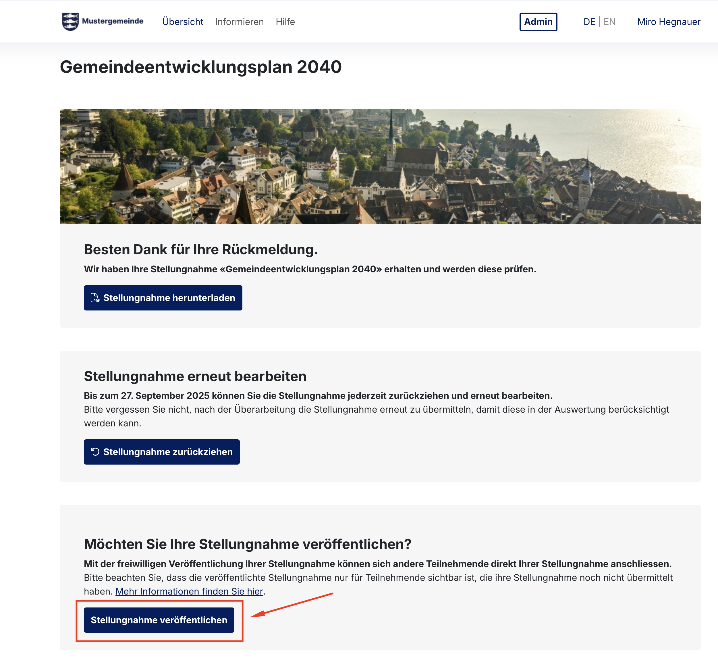 Standardmässig ist die übermittelte Stellungnahme nur für Sie und die Organisation ersichtlich, welche die Mitwirkung durchführt. Mit der Veröffentlichungsfunktion haben Sie die Möglichkeit, Ihre Stellungnahme für andere Mitwirkungsteilnehmende zu veröffentlichen. Diese können dann bei der Erfassung der Stellungnahme sich teilweise oder vollständig an Ihrer Stellungnahme anschliessen.