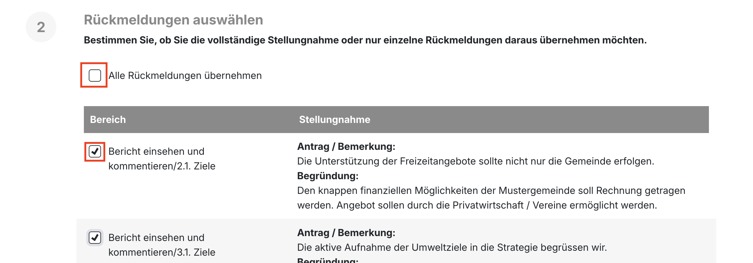 Sie können nun auswählen, ob Sie sich allen Rückmeldungen der Stellungnahme oder nur ausgewählten Rückmeldungen anschliessen möchten. Wählen Sie dazu entweder die Option «Alle Rückmeldungen übernehmen» aus oder selektieren Sie einzelne Rückmeldungen.