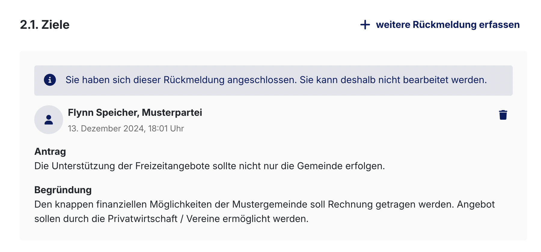 Bei den Textrückmeldungen können Sie die angeschlossenen Rückmeldungen in den jeweiligen Kapiteln einsehen. Diese sind mit einem grauen Textbalken markiert. Bitte beachten Sie, dass Sie angeschlossene Rückmeldungen nicht bearbeiten können. Falls Sie sich einer Rückmeldung nicht mehr anschliessen möchten, klicken Sie auf «Rückmeldung löschen».