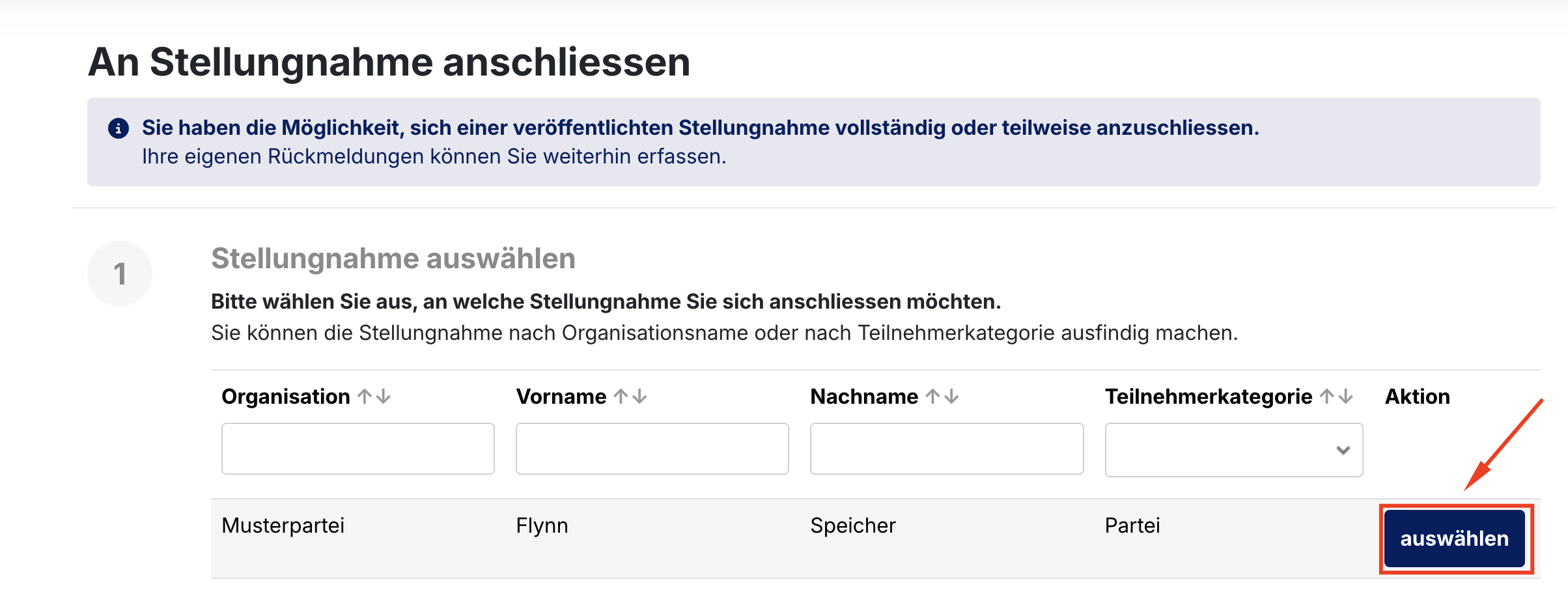 In der folgenden Übersicht können Sie die verschiedenen Organisationen und Personen einsehen, welche ihre Stellungnahme veröffentlicht haben. Klicken Sie bei der gewünschten Person oder Organisation auf «Auswählen».