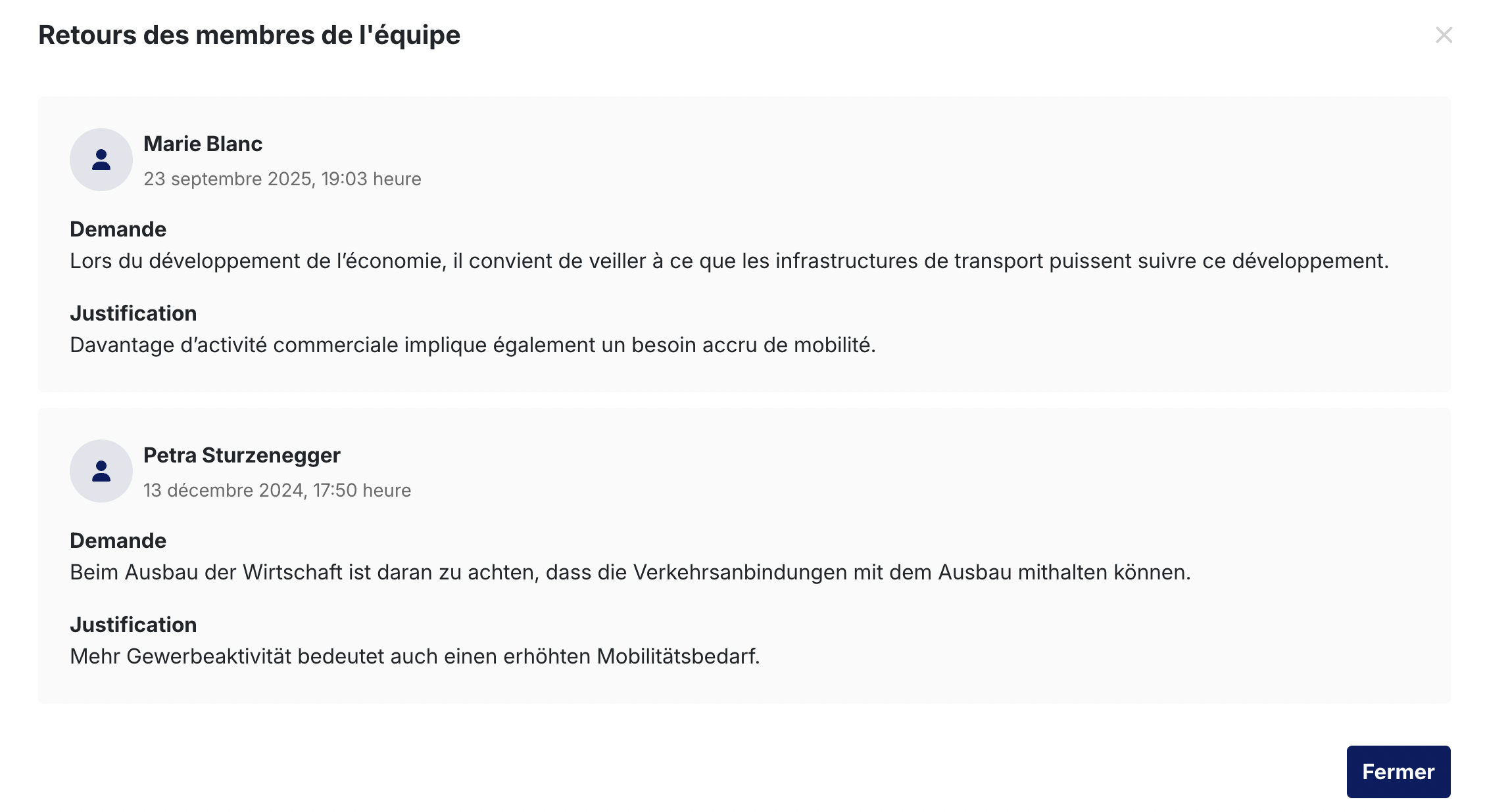 Lorsqu'une réaction textuelle est saisie pour un document ou une question ouverte, elle est immédiatement visible pour les autres membres de l'équipe. Chaque fois qu'un membre de l'équipe effectue une modification, une nouvelle version est automatiquement créée. Il est ainsi possible de savoir à tout moment qui a saisi quoi et quand. Pour les points de la carte et les enquêtes, la dernière version de l'équipe est automatiquement affichée.