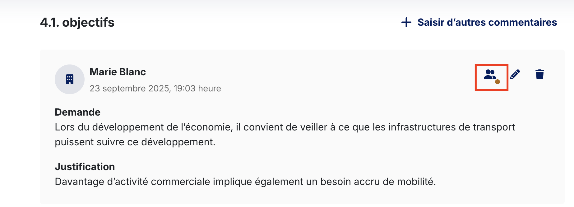 Le nom de la personne qui a saisi l'avis est également visible dans le projet. Cette information n'est visible que pour votre équipe, l'administration ne voit pas le nom de la personne individuelle, car votre avis est transmis au nom de l'organisation.